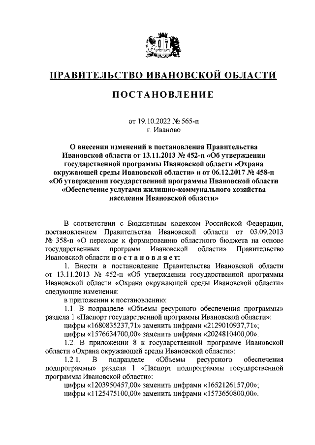 Постановление Правительства Ивановской области от 19.10.2022 N 565-п "О внесении изменений в постановления Правительства Ивановской области от 13.11.2013 N 452-п "Об утверждении государственной программы Ивановской области "Охрана окружающей среды Ивановской области" и от 06.12.2017 N 458-п "Об утверждении государственной программы Ивановской области "Обеспечение услугами жилищно-коммунального хозяйства населения Ивановской области"