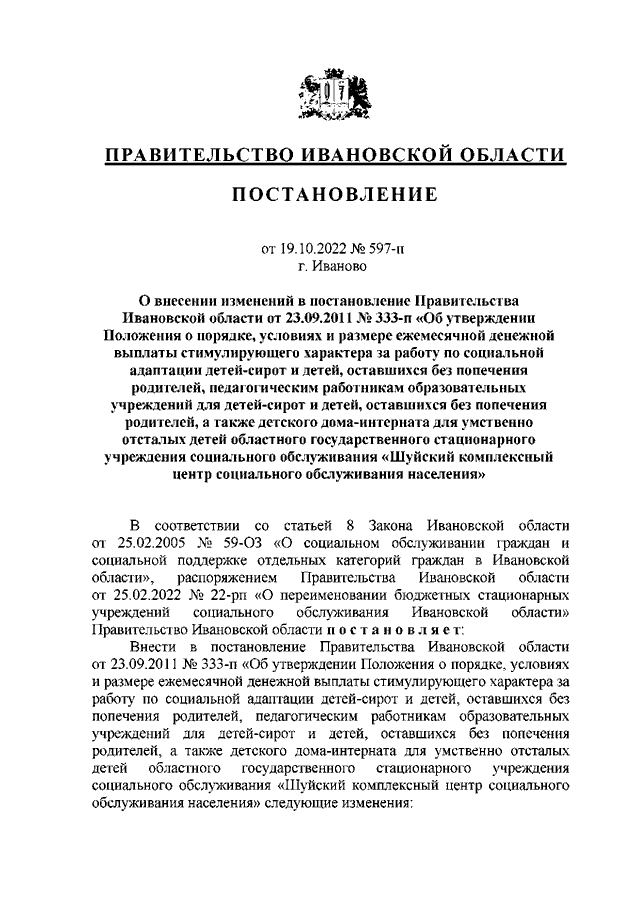 Постановление Правительства Ивановской области от 19.10.2022 N 597-п "О внесении изменений в постановление Правительства Ивановской области от 23.09.2011 N 333-п "Об утверждении Положения о порядке, условиях и размере ежемесячной денежной выплаты стимулирующего характера за работу по социальной адаптации детей-сирот и детей, оставшихся без попечения родителей, педагогическим работникам образовательных учреждений для детей-сирот и детей, оставшихся без попечения родителей, а также детского дома-интерната для умственно отсталых детей областного государственного стационарного учреждения социального обслуживания "Шуйский комплексный центр социального обслуживания населения"