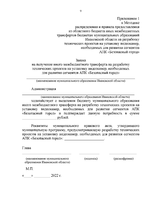 Постановление Правительства Ивановской области от 19.10.2022 N 587-п "Об утверждении Методики распределения и правила предоставления из областного бюджета иных межбюджетных трансфертов бюджетам муниципальных образований Ивановской области на разработку технических проектов на установку видеокамер, необходимых для развития сегментов АПК "Безопасный город"