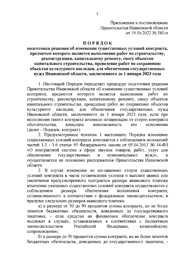 Постановление Правительства Ивановской области от 19.10.2022 N 585-п "Об утверждении Порядка подготовки решения об изменении существенных условий контракта, предметом которого является выполнение работ по строительству, реконструкции, капитальному ремонту, сносу объектов капитального строительства, проведение работ по сохранению объектов культурного наследия, для обеспечения государственных нужд Ивановской области, заключенного до 1 января 2023 года"