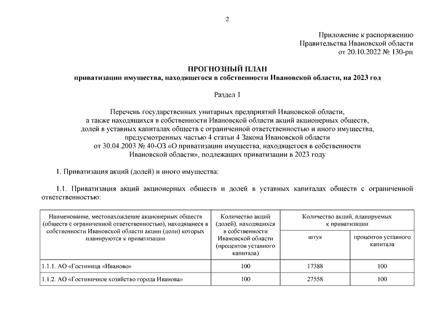 Распоряжение Правительства Ивановской области от 20.10.2022 N 130-рп "Об утверждении прогнозного плана приватизации имущества, находящегося в собственности Ивановской области, на 2023 год"