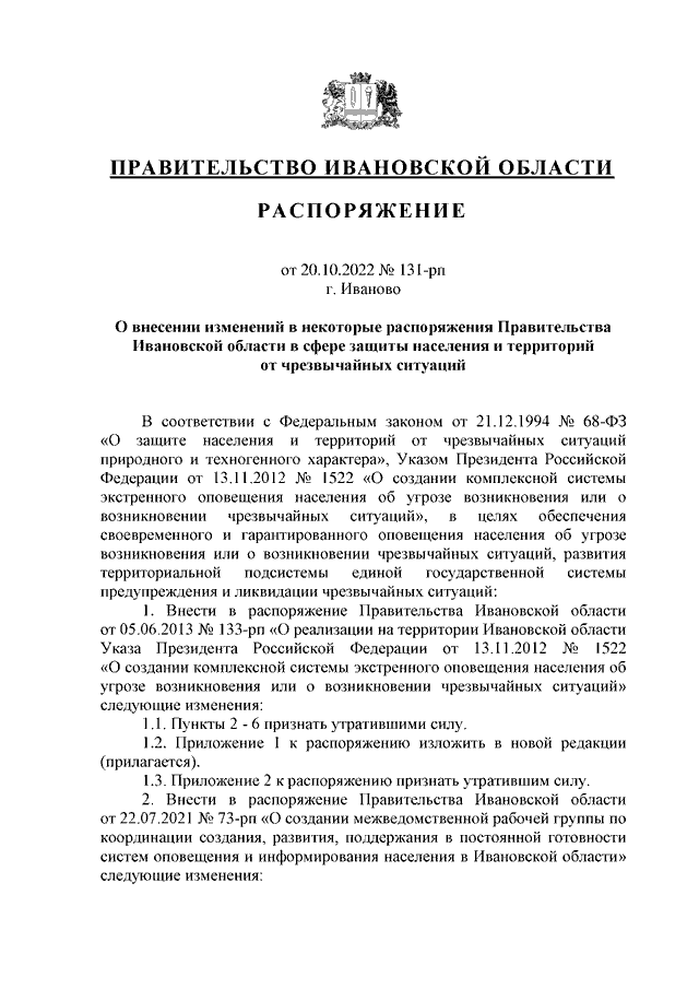 Распоряжение Правительства Ивановской области от 20.10.2022 N 131-рп "О внесении изменений в некоторые распоряжения Правительства Ивановской области в сфере защиты населения и территорий от чрезвычайных ситуаций" (вместе с "Перечнем зон экстренного оповещения населения на территории Ивановской области")