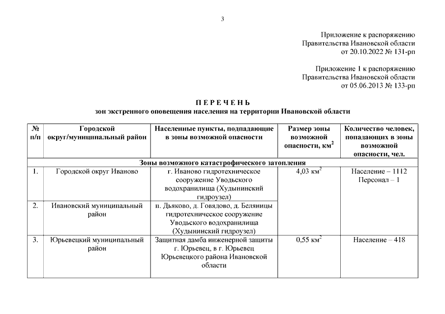 Распоряжение Правительства Ивановской области от 20.10.2022 N 131-рп "О внесении изменений в некоторые распоряжения Правительства Ивановской области в сфере защиты населения и территорий от чрезвычайных ситуаций" (вместе с "Перечнем зон экстренного оповещения населения на территории Ивановской области")
