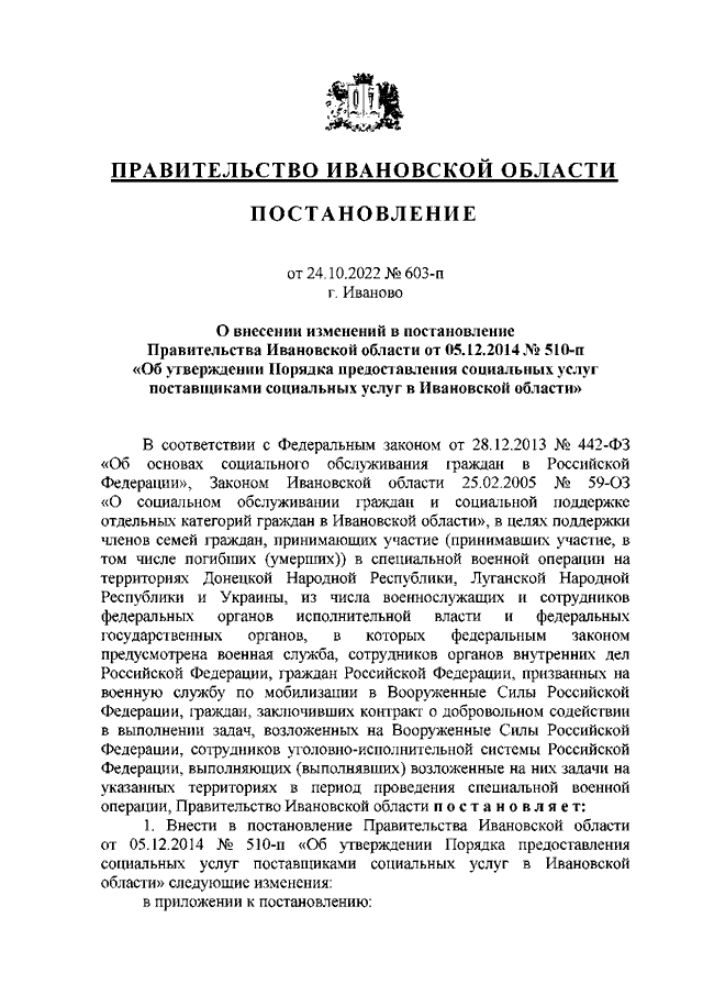 Постановление Правительства Ивановской области от 24.10.2022 N 603-п "О внесении изменений в постановление Правительства Ивановской области от 05.12.2014 N 510-п "Об утверждении Порядка предоставления социальных услуг поставщиками социальных услуг в Ивановской области"