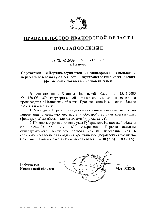 Постановление Правительства Ивановской области от 03.11.2006 N 179-п "Об утверждении Порядка осуществления единовременных выплат на переселение в сельскую местность и обустройство глав крестьянских (фермерских) хозяйств и членов их семей"