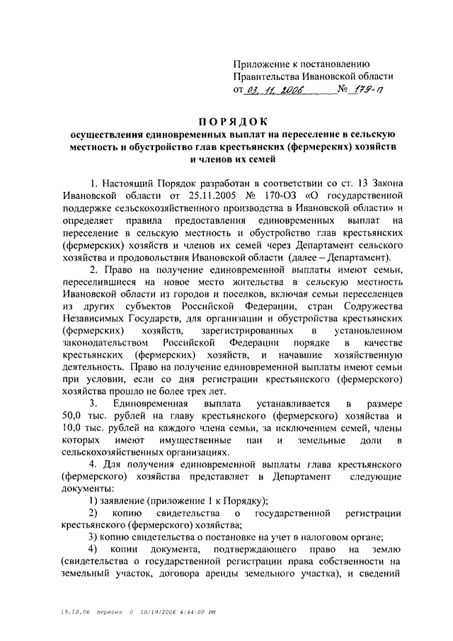 Постановление Правительства Ивановской области от 03.11.2006 N 179-п "Об утверждении Порядка осуществления единовременных выплат на переселение в сельскую местность и обустройство глав крестьянских (фермерских) хозяйств и членов их семей"