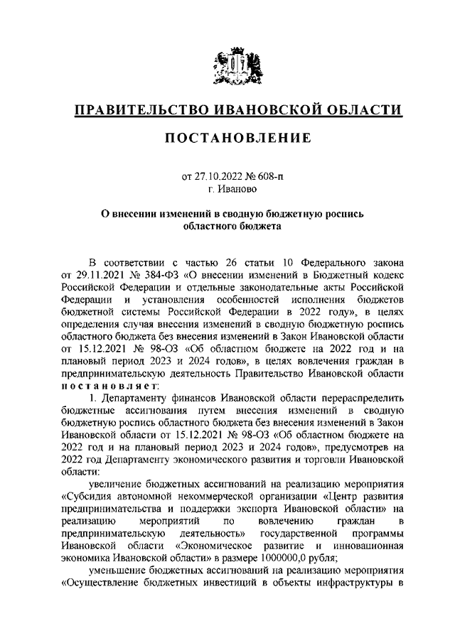 Постановление Правительства Ивановской области от 27.10.2022 N 608-п "О внесении изменений в сводную бюджетную роспись областного бюджета"