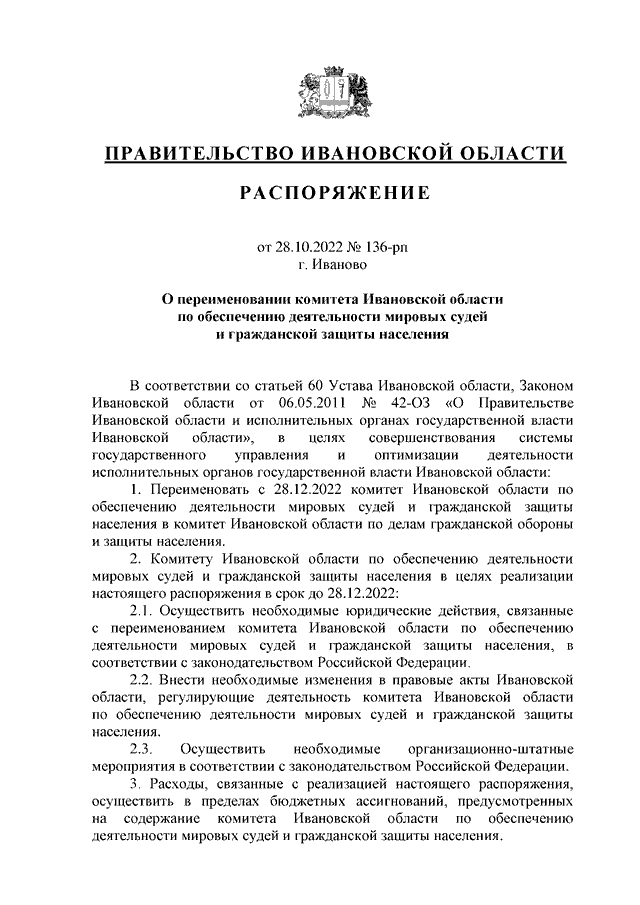 Распоряжение Правительства Ивановской области от 28.10.2022 N 136-рп "О переименовании комитета Ивановской области по обеспечению деятельности мировых судей и гражданской защиты населения"