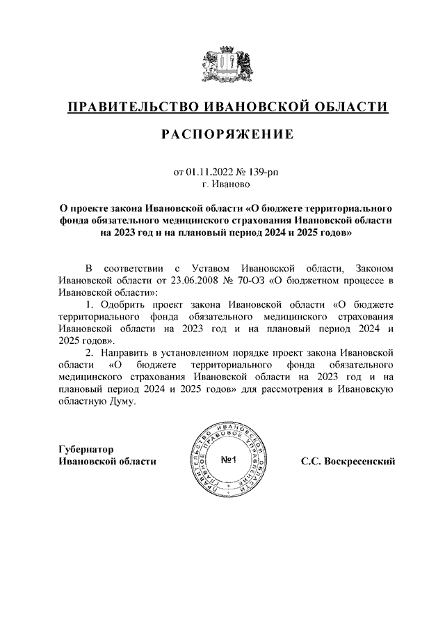 Распоряжение Правительства Ивановской области от 01.11.2022 N 139-рп "О проекте закона Ивановской области "О бюджете территориального фонда обязательного медицинского страхования Ивановской области на 2023 год и на плановый период 2024 и 2025 годов"