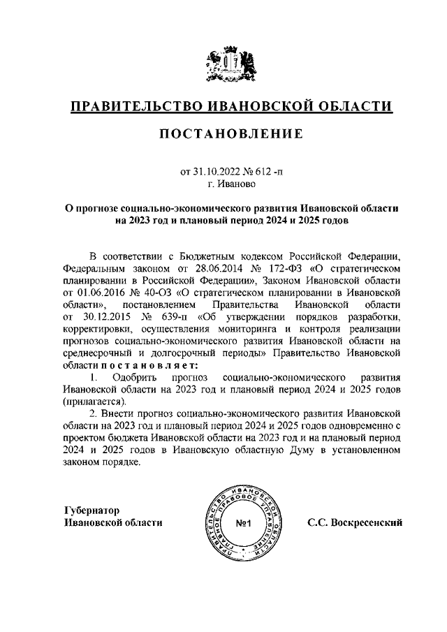 Постановление Правительства Ивановской области от 31.10.2022 N 612-п "О прогнозе социально-экономического развития Ивановской области на 2023 год и плановый период 2024 и 2025 годов"