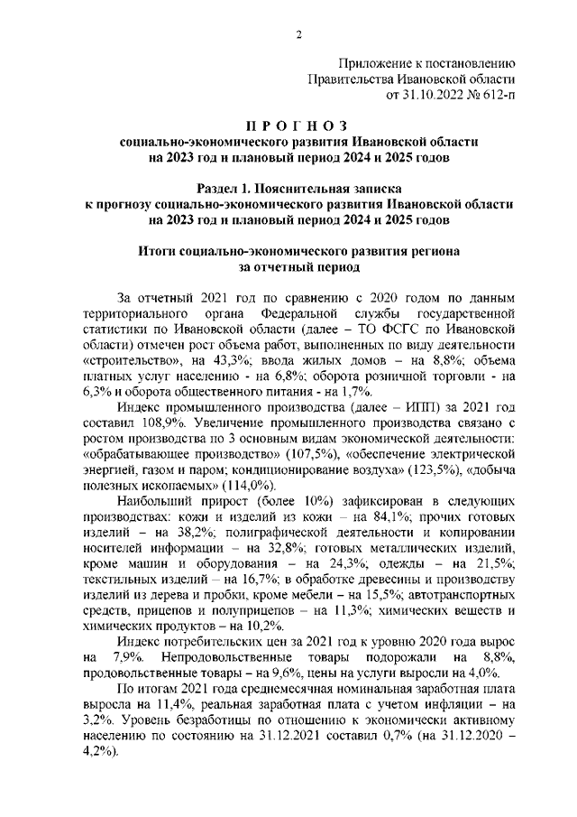 Постановление Правительства Ивановской области от 31.10.2022 N 612-п "О прогнозе социально-экономического развития Ивановской области на 2023 год и плановый период 2024 и 2025 годов"