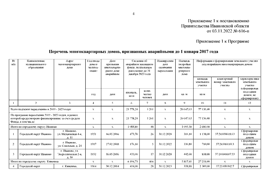 Постановление Правительства Ивановской области от 03.11.2022 N 616-п "О внесении изменений в постановление Правительства Ивановской области от 09.04.2019 N 131-п "Об утверждении региональной адресной программы "Переселение граждан из аварийного жилищного фонда на территории Ивановской области на 2019 - 2023 годы" (вместе с "Перечнем многоквартирных домов, признанных аварийными до 1 января 2017 года", "Планом реализации мероприятий по переселению граждан из аварийного жилищного фонда, признанного таковым до 1 января 2017 года, по способам переселения")