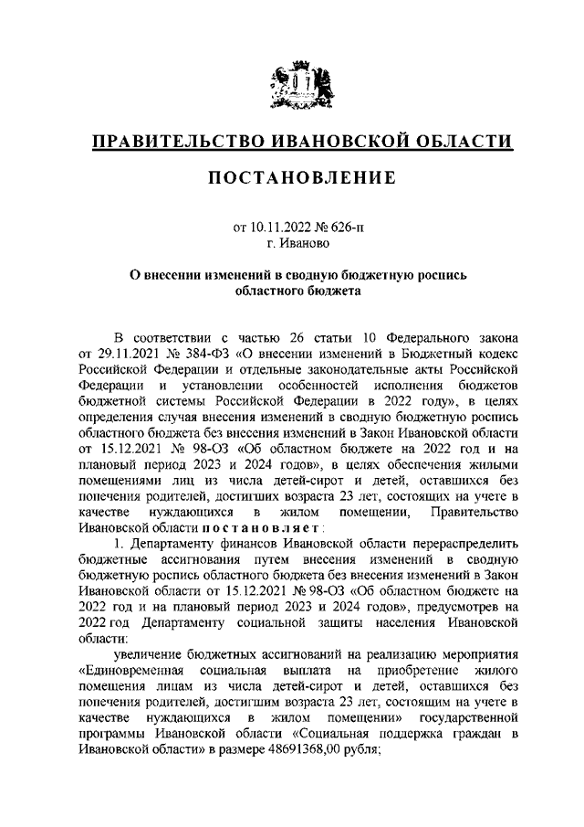 Постановление Правительства Ивановской области от 10.11.2022 N 626-п "О внесении изменений в сводную бюджетную роспись областного бюджета"