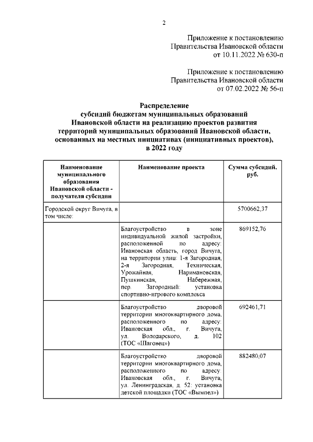 Постановление Правительства Ивановской области от 10.11.2022 N 630-п "О внесении изменения в постановление Правительства Ивановской области от 07.02.2022 N 56-п "О распределении субсидий бюджетам муниципальных образований Ивановской области на реализацию проектов развития территорий муниципальных образований Ивановской области, основанных на местных инициативах (инициативных проектов), в 2022 году"