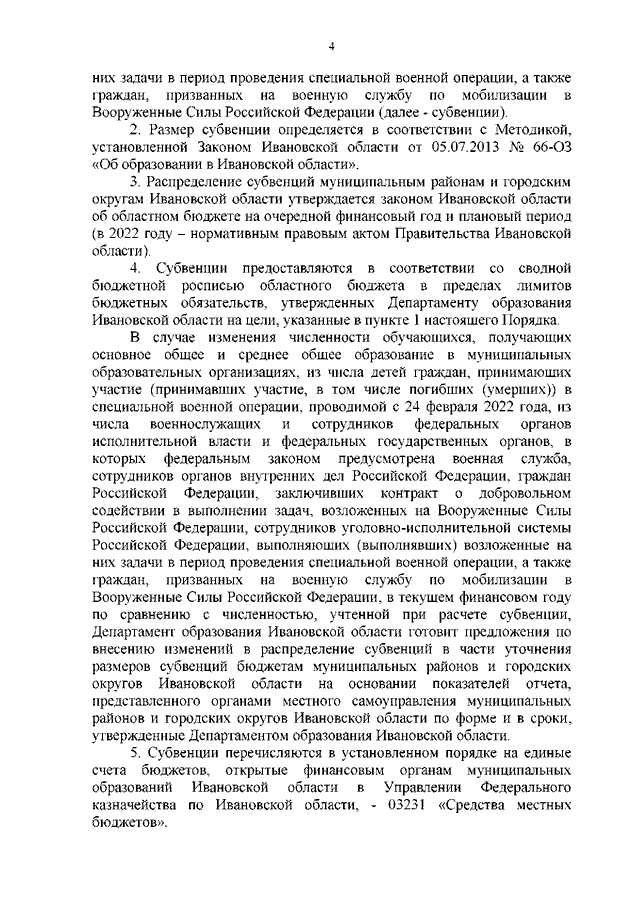 Постановление Правительства Ивановской области от 17.11.2022 N 633-п "Об утверждении Порядка предоставления субвенций бюджетам муниципальных районов и городских округов Ивановской области на осуществление переданных органам местного самоуправления государственных полномочий Ивановской области по предоставлению бесплатного горячего питания обучающимся, получающим основное общее и среднее общее образование в муниципальных образовательных организациях, из числа детей граждан, принимающих участие (принимавших участие, в том числе погибших (умерших)) в специальной военной операции, проводимой с 24 февраля 2022 года, из числа военнослужащих и сотрудников федеральных органов исполнительной власти и федеральных государственных органов, в которых федеральным законом предусмотрена военная служба, сотрудников органов внутренних дел Российской Федерации, граждан Российской Федерации, заключивших контракт о добровольном содействии в выполнении задач, возложенных на Вооруженные Силы Российской Федерации, сотрудников уголовно-исполнительной системы Российской Федерации, выполняющих (выполнявших) возложенные на них задачи в период проведения специальной военной операции, а также граждан, призванных на военную службу по мобилизации в Вооруженные Силы Российской Федерации"