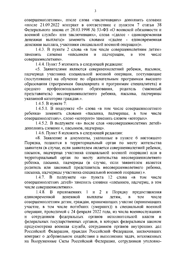 Постановление Правительства Ивановской области от 17.11.2022 N 632-п "О внесении изменений в постановление Правительства Ивановской области от 27.10.2022 N 609-п "Об установлении единовременной денежной выплаты детям, в том числе совершеннолетним детям, граждан, принимающих участие (принимавших участие, в том числе погибших (умерших)) в специальной военной операции, проводимой с 24 февраля 2022 года, из числа военнослужащих и сотрудников федеральных органов исполнительной власти и федеральных государственных органов, в которых федеральным законом предусмотрена военная служба, сотрудников органов внутренних дел Российской Федерации, граждан Российской Федерации, заключивших контракт о добровольном содействии в выполнении задач, возложенных на Вооруженные Силы Российской Федерации, сотрудников уголовно-исполнительной системы Российской Федерации, выполняющих (выполнявших) возложенные на них задачи в период проведения специальной военной операции, а также граждан, призванных на военную службу по мобилизации в Вооруженные Силы Российской Федерации, поступающим (поступившим) на обучение по образовательным программам высшего образования (программам бакалавриата и программам специалитета) и среднего профессионального образования"