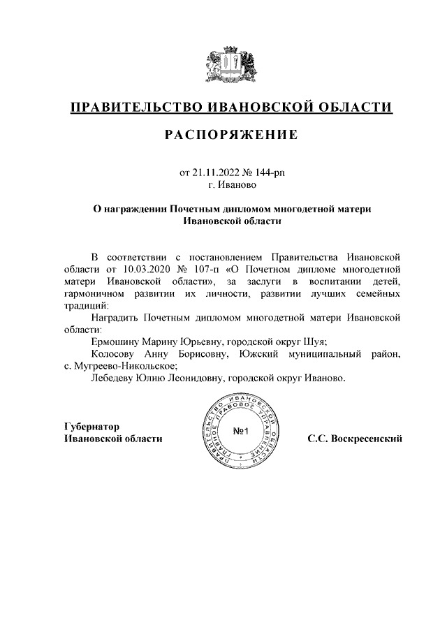 Распоряжение Правительства Ивановской области от 21.11.2022 N 144-рп "О награждении Почетным дипломом многодетной матери Ивановской области"