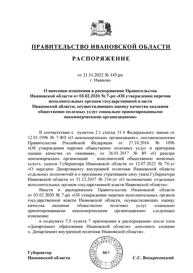 Распоряжение Правительства Ивановской области от 21.11.2022 N 145-рп "О внесении изменения в распоряжение Правительства Ивановской области от 03.02.2020 N 7-рп "Об утверждении перечня исполнительных органов государственной власти Ивановской области, осуществляющих оценку качества оказания общественно полезных услуг социально ориентированными некоммерческими организациями"