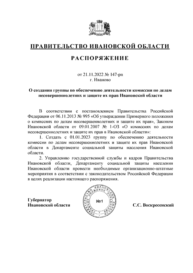Распоряжение Правительства Ивановской области от 21.11.2022 N 147-рп "О создании группы по обеспечению деятельности комиссии по делам несовершеннолетних и защите их прав Ивановской области"