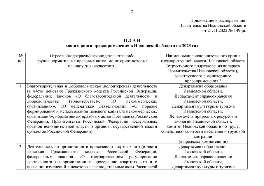 Распоряжение Правительства Ивановской области от 21.11.2022 N 149-рп "Об утверждении плана мониторинга правоприменения в Ивановской области на 2023 год"