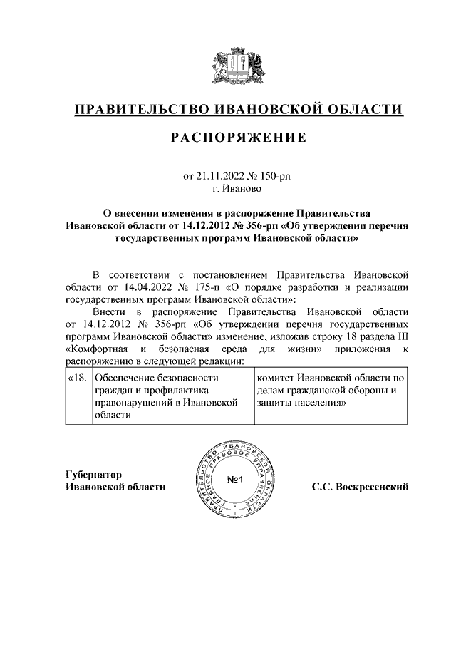 Распоряжение Правительства Ивановской области от 21.11.2022 N 150-рп "О внесении изменения в распоряжение Правительства Ивановской области от 14.12.2012 N 356-рп "Об утверждении перечня государственных программ Ивановской области"