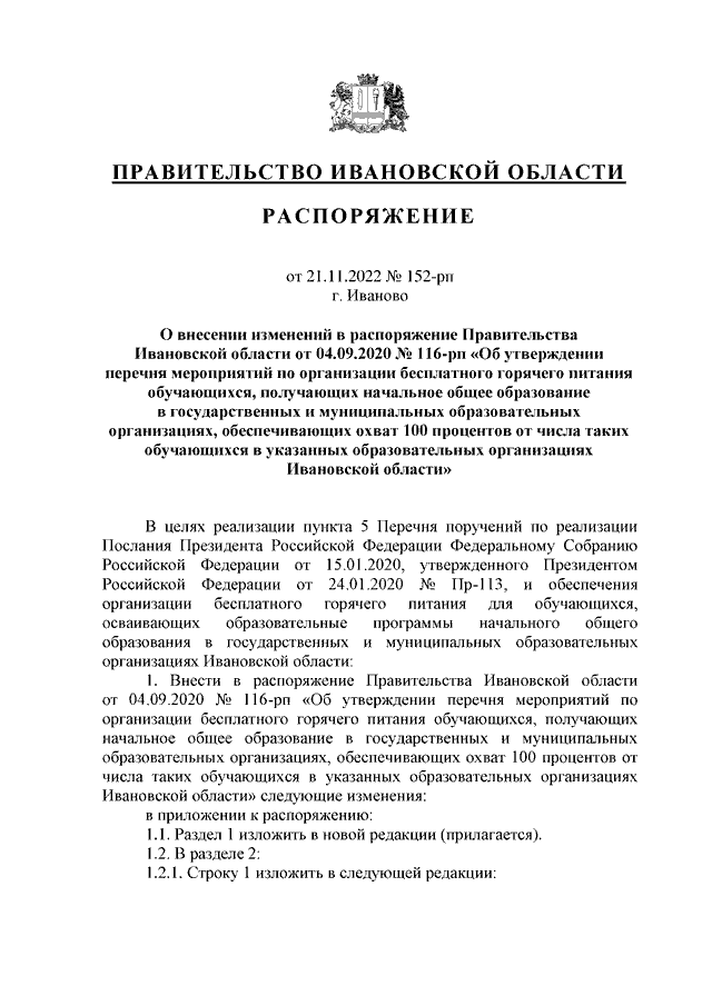 Распоряжение Правительства Ивановской области от 21.11.2022 N 152-рп "О внесении изменений в распоряжение Правительства Ивановской области от 04.09.2020 N 116-рп "Об утверждении перечня мероприятий по организации бесплатного горячего питания обучающихся, получающих начальное общее образование в государственных и муниципальных образовательных организациях, обеспечивающих охват 100 процентов от числа таких обучающихся в указанных образовательных организациях Ивановской области"