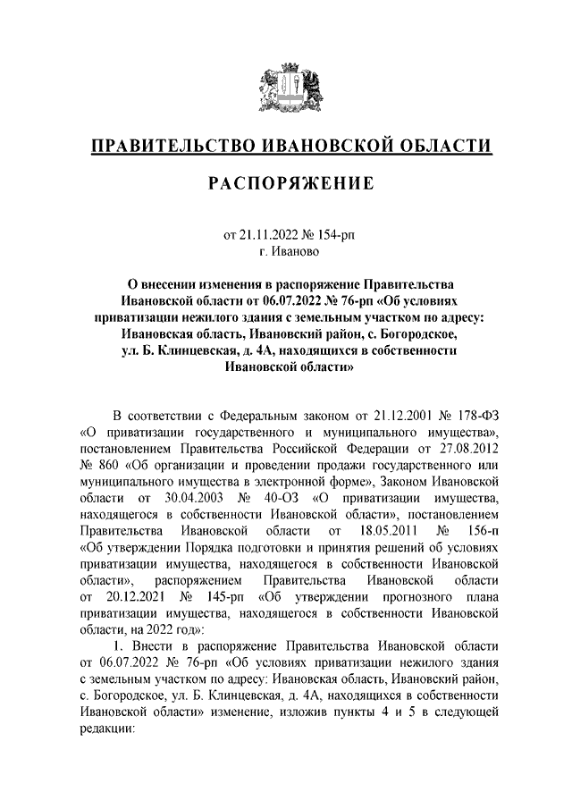 Распоряжение Правительства Ивановской области от 21.11.2022 N 154-рп "О внесении изменения в распоряжение Правительства Ивановской области от 06.07.2022 N 76-рп "Об условиях приватизации нежилого здания с земельным участком по адресу: Ивановская область, Ивановский район, с. Богородское, ул. Б. Клинцевская, д. 4А, находящихся в собственности Ивановской области"