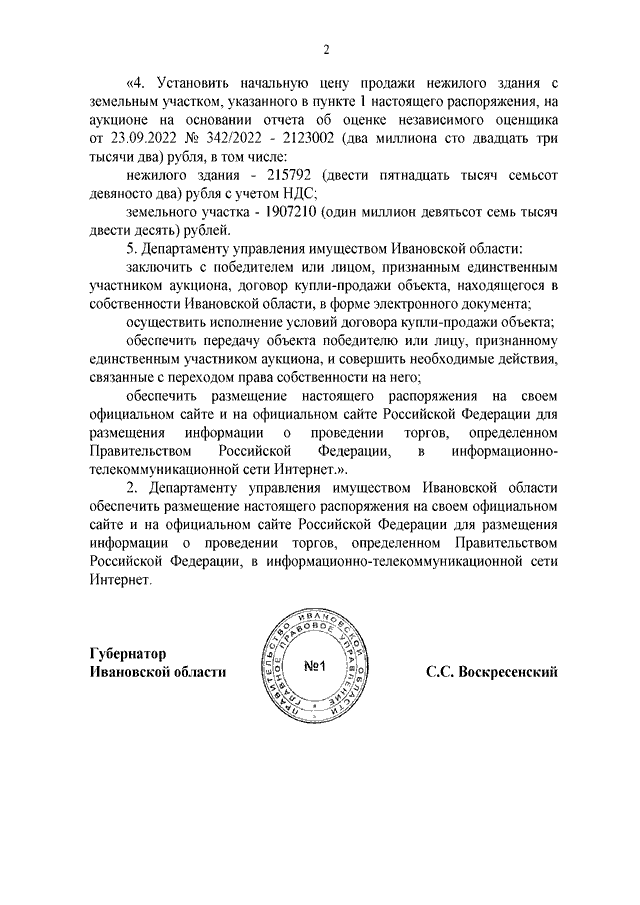 Распоряжение Правительства Ивановской области от 21.11.2022 N 154-рп "О внесении изменения в распоряжение Правительства Ивановской области от 06.07.2022 N 76-рп "Об условиях приватизации нежилого здания с земельным участком по адресу: Ивановская область, Ивановский район, с. Богородское, ул. Б. Клинцевская, д. 4А, находящихся в собственности Ивановской области"