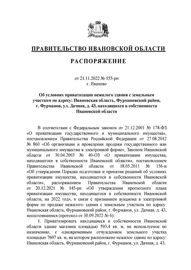 Распоряжение Правительства Ивановской области от 21.11.2022 N 155-рп "Об условиях приватизации нежилого здания с земельным участком по адресу: Ивановская область, Фурмановский район, г. Фурманов, ул. Дачная, д. 43, находящихся в собственности Ивановской области"
