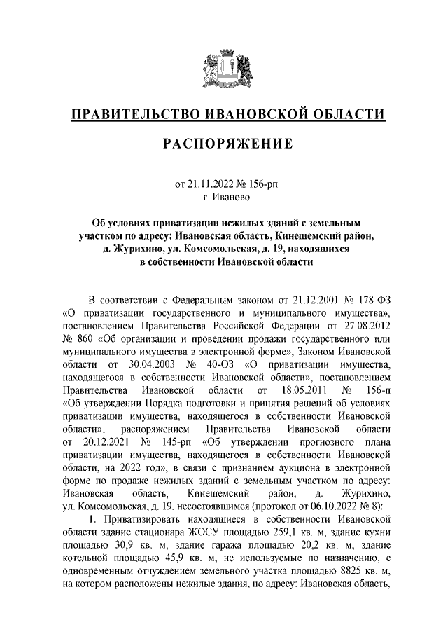 Распоряжение Правительства Ивановской области от 21.11.2022 N 156-рп "Об условиях приватизации нежилых зданий с земельным участком по адресу: Ивановская область, Кинешемский район, д. Журихино, ул. Комсомольская, д. 19, находящихся в собственности Ивановской области"