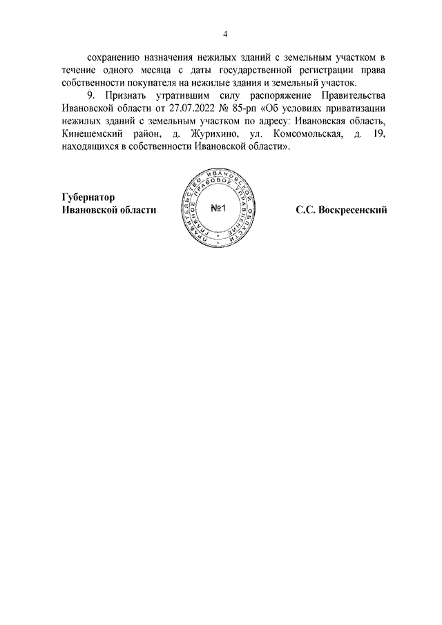 Распоряжение Правительства Ивановской области от 21.11.2022 N 156-рп "Об условиях приватизации нежилых зданий с земельным участком по адресу: Ивановская область, Кинешемский район, д. Журихино, ул. Комсомольская, д. 19, находящихся в собственности Ивановской области"