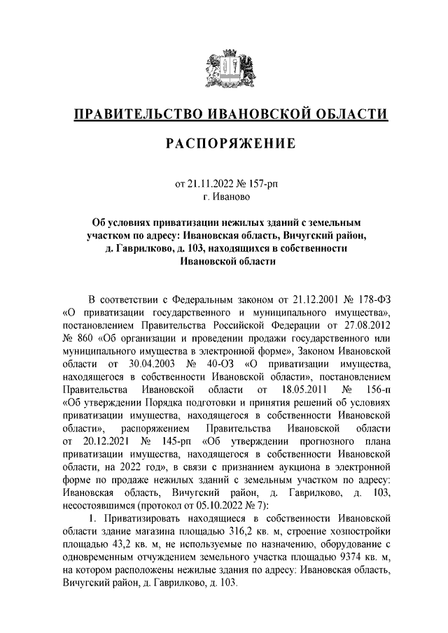 Распоряжение Правительства Ивановской области от 21.11.2022 N 157-рп "Об условиях приватизации нежилых зданий с земельным участком по адресу: Ивановская область, Вичугский район, д. Гаврилково, д. 103, находящихся в собственности Ивановской области"