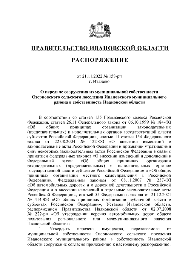 Распоряжение Правительства Ивановской области от 21.11.2022 N 158-рп "О передаче сооружения из муниципальной собственности Озерновского сельского поселения Ивановского муниципального района в собственность Ивановской области"