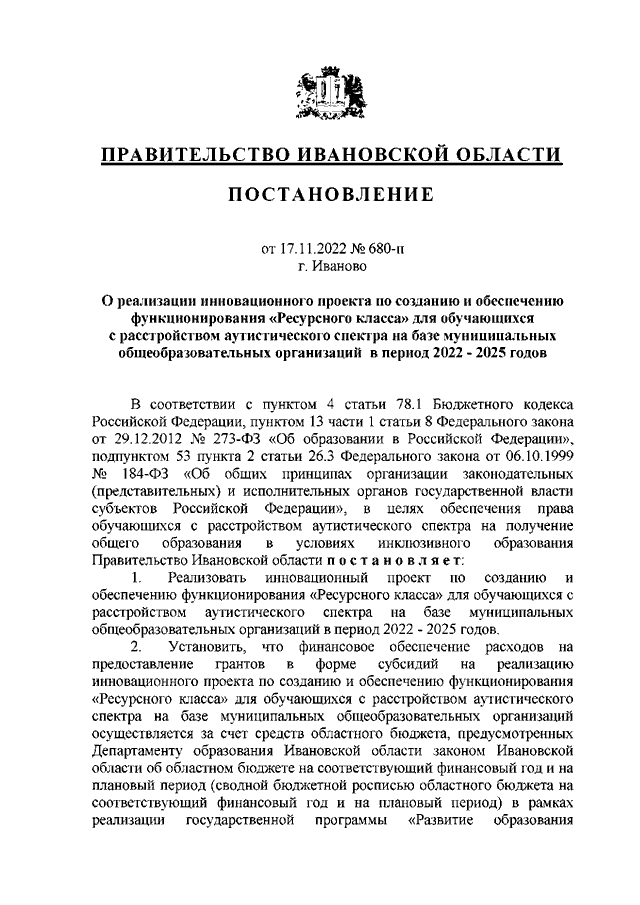 Постановление Правительства Ивановской области от 17.11.2022 N 680-п "О реализации инновационного проекта по созданию и обеспечению функционирования "Ресурсного класса" для обучающихся с расстройством аутистического спектра на базе муниципальных общеобразовательных организаций в период 2022 - 2025 годов"