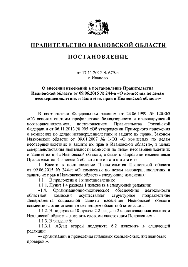 Постановление Правительства Ивановской области от 17.11.2022 N 679-п "О внесении изменений в постановление Правительства Ивановской области от 09.06.2015 N 244-п "О комиссиях по делам несовершеннолетних и защите их прав в Ивановской области"