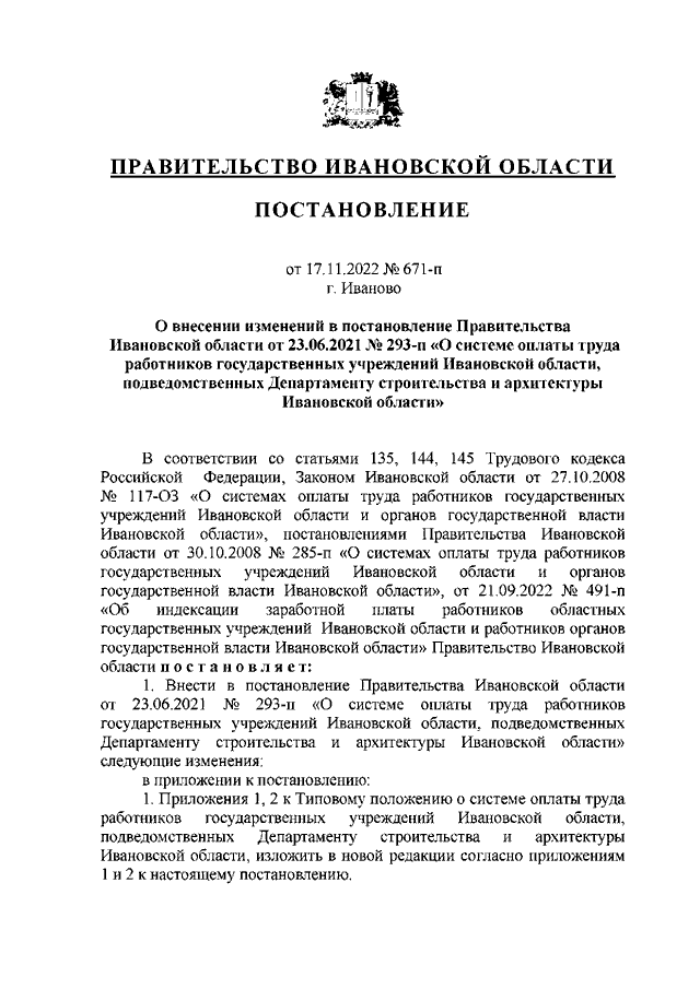 Постановление Правительства Ивановской области от 17.11.2022 N 671-п "О внесении изменений в постановление Правительства Ивановской области от 23.06.2021 N 293-п "О системе оплаты труда работников государственных учреждений Ивановской области, подведомственных Департаменту строительства и архитектуры Ивановской области"