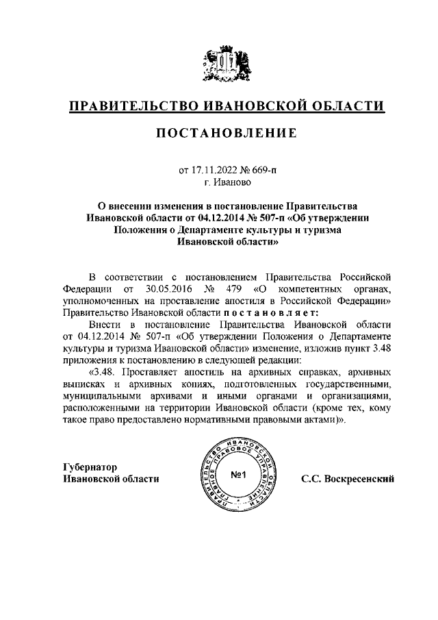 Постановление Правительства Ивановской области от 17.11.2022 N 669-п "О внесении изменения в постановление Правительства Ивановской области от 04.12.2014 N 507-п "Об утверждении Положения о Департаменте культуры и туризма Ивановской области"