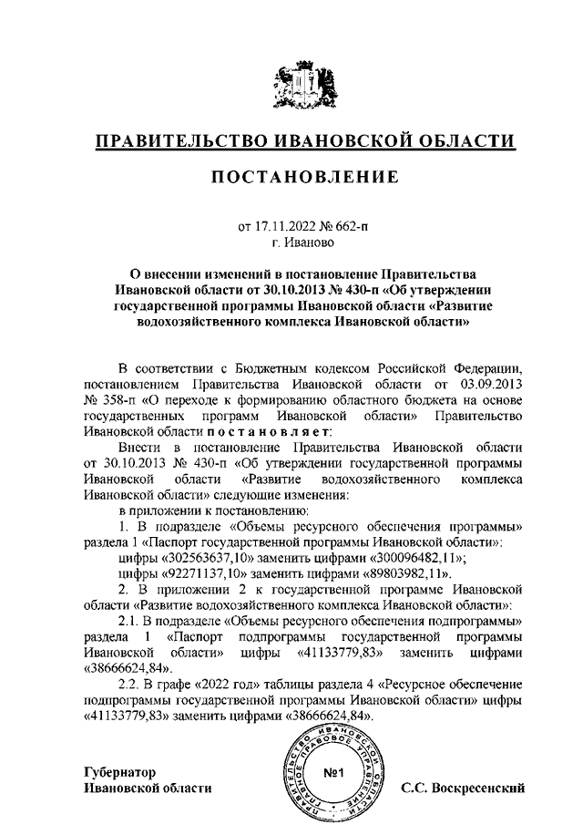 Постановление Правительства Ивановской области от 17.11.2022 N 662-п "О внесении изменений в постановление Правительства Ивановской области от 30.10.2013 N 430-п "Об утверждении государственной программы Ивановской области "Развитие водохозяйственного комплекса Ивановской области"