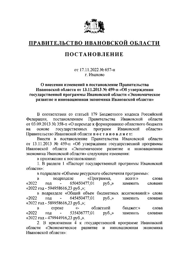 Постановление Правительства Ивановской области от 17.11.2022 N 657-п "О внесении изменений в постановление Правительства Ивановской области от 13.11.2013 N 459-п "Об утверждении государственной программы Ивановской области "Экономическое развитие и инновационная экономика Ивановской области"
