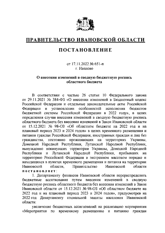 Постановление Правительства Ивановской области от 17.11.2022 N 651-п "О внесении изменений в сводную бюджетную роспись областного бюджета"