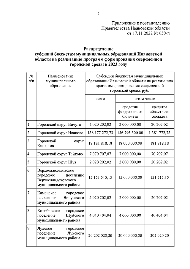 Постановление Правительства Ивановской области от 17.11.2022 N 650-п "О распределении субсидий бюджетам муниципальных образований на реализацию программ формирования современной городской среды в 2023 году"