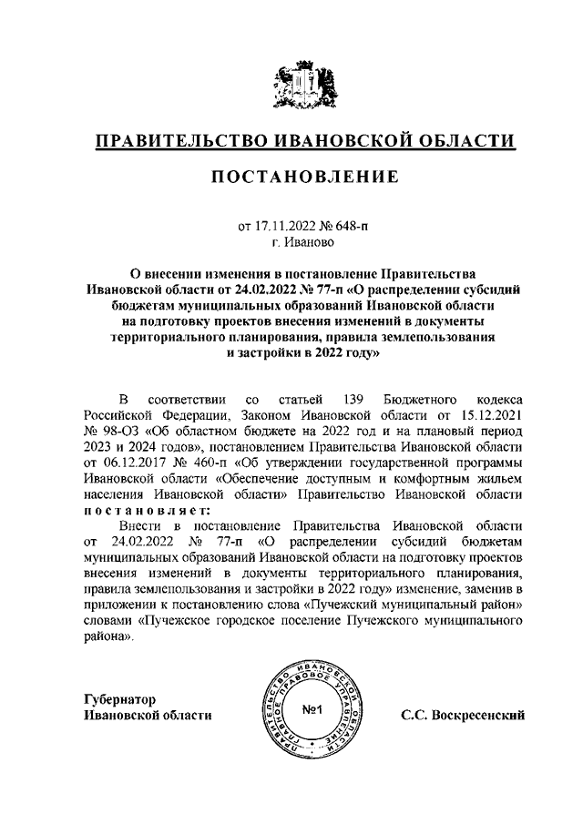 Постановление Правительства Ивановской области от 17.11.2022 N 648-п "О внесении изменения в постановление Правительства Ивановской области от 24.02.2022 N 77-п "О распределении субсидий бюджетам муниципальных образований Ивановской области на подготовку проектов внесения изменений в документы территориального планирования, правила землепользования и застройки в 2022 году"