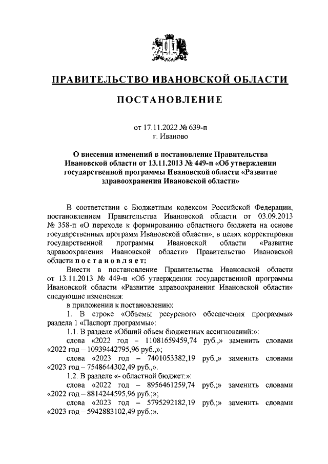 Постановление Правительства Ивановской области от 17.11.2022 N 639-п "О внесении изменений в постановление Правительства Ивановской области от 13.11.2013 N 449-п "Об утверждении государственной программы Ивановской области "Развитие здравоохранения Ивановской области"
