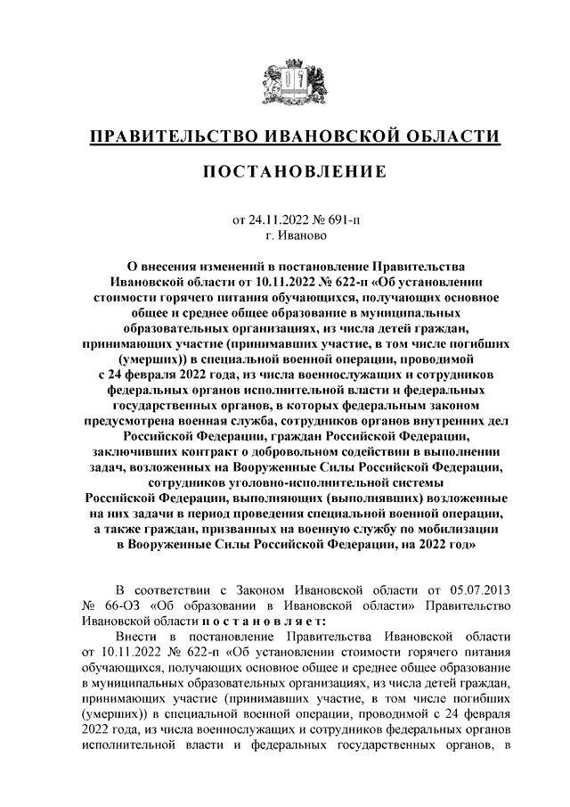 Постановление Правительства Ивановской области от 24.11.2022 N 691-п "О внесении изменений в постановление Правительства Ивановской области от 10.11.2022 N 622-п "Об установлении стоимости горячего питания обучающихся, получающих основное общее и среднее общее образование в муниципальных образовательных организациях, из числа детей граждан, принимающих участие (принимавших участие, в том числе погибших (умерших)) в специальной военной операции, проводимой с 24 февраля 2022 года, из числа военнослужащих и сотрудников федеральных органов исполнительной власти и федеральных государственных органов, в которых федеральным законом предусмотрена военная служба, сотрудников органов внутренних дел Российской Федерации, граждан Российской Федерации, заключивших контракт о добровольном содействии в выполнении задач, возложенных на Вооруженные Силы Российской Федерации, сотрудников уголовно-исполнительной системы Российской Федерации, выполняющих (выполнявших) возложенные на них задачи в период проведения специальной военной операции, а также граждан, призванных на военную службу по мобилизации в Вооруженные Силы Российской Федерации, на 2022 год"