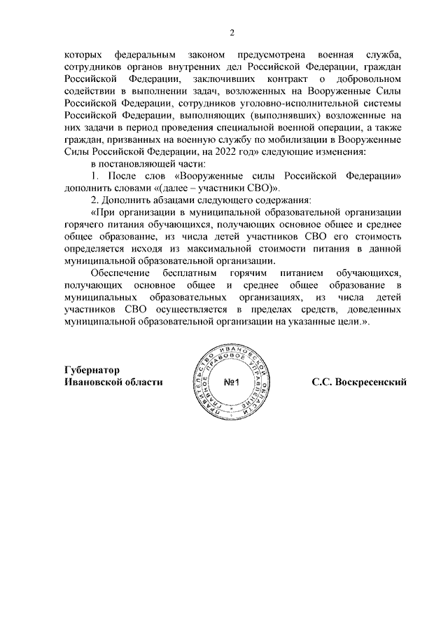 Постановление Правительства Ивановской области от 24.11.2022 N 691-п "О внесении изменений в постановление Правительства Ивановской области от 10.11.2022 N 622-п "Об установлении стоимости горячего питания обучающихся, получающих основное общее и среднее общее образование в муниципальных образовательных организациях, из числа детей граждан, принимающих участие (принимавших участие, в том числе погибших (умерших)) в специальной военной операции, проводимой с 24 февраля 2022 года, из числа военнослужащих и сотрудников федеральных органов исполнительной власти и федеральных государственных органов, в которых федеральным законом предусмотрена военная служба, сотрудников органов внутренних дел Российской Федерации, граждан Российской Федерации, заключивших контракт о добровольном содействии в выполнении задач, возложенных на Вооруженные Силы Российской Федерации, сотрудников уголовно-исполнительной системы Российской Федерации, выполняющих (выполнявших) возложенные на них задачи в период проведения специальной военной операции, а также граждан, призванных на военную службу по мобилизации в Вооруженные Силы Российской Федерации, на 2022 год"