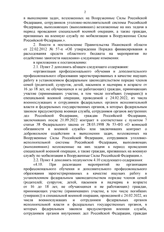 Постановление Правительства Ивановской области от 24.11.2022 N 690-п "О внесении изменений в постановления Правительства Ивановской области от 08.12.2008 N 321-п "О реализации полномочий в области содействия занятости населения в Ивановской области", от 22.02.2012 N 57-п "Об утверждении Порядка финансирования и расходования средств областного бюджета на мероприятия по содействию занятости населения"