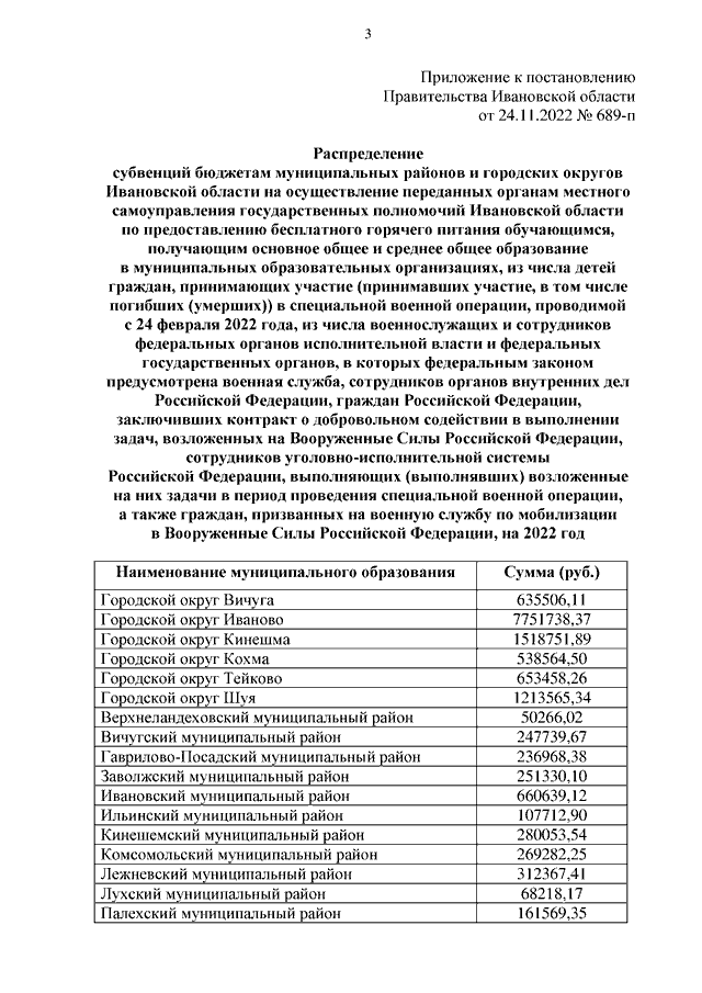 Постановление Правительства Ивановской области от 24.11.2022 N 689-п "Об утверждении распределения субвенций бюджетам муниципальных районов и городских округов Ивановской области на осуществление переданных органам местного самоуправления государственных полномочий Ивановской области по предоставлению бесплатного горячего питания обучающимся, получающим основное общее и среднее общее образование в муниципальных образовательных организациях, из числа детей граждан, принимающих участие (принимавших участие, в том числе погибших (умерших)) в специальной военной операции, проводимой с 24 февраля 2022 года, из числа военнослужащих и сотрудников федеральных органов исполнительной власти и федеральных государственных органов, в которых федеральным законом предусмотрена военная служба, сотрудников органов внутренних дел Российской Федерации, граждан Российской Федерации, заключивших контракт о добровольном содействии в выполнении задач, возложенных на Вооруженные Силы Российской Федерации, сотрудников уголовно-исполнительной системы Российской Федерации, выполняющих (выполнявших) возложенные на них задачи в период проведения специальной военной операции, а также граждан, призванных на военную службу по мобилизации в Вооруженные Силы Российской Федерации, на 2022 год"