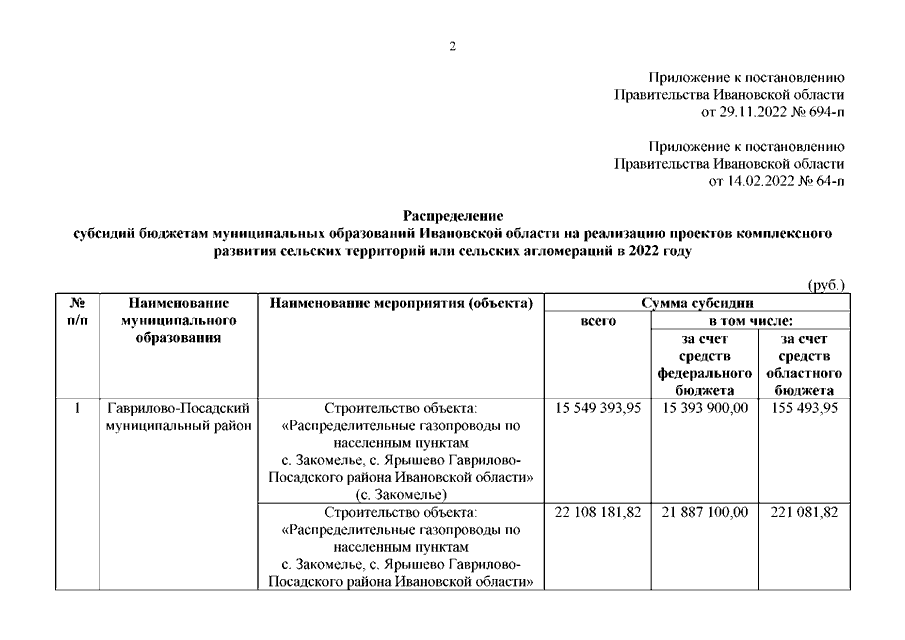 Постановление Правительства Ивановской области от 29.11.2022 N 694-п "О внесении изменения в постановление Правительства Ивановской области от 14.02.2022 N 64-п "О распределении субсидий бюджетам муниципальных образований Ивановской области на реализацию проектов комплексного развития сельских территорий или сельских агломераций в 2022 году"