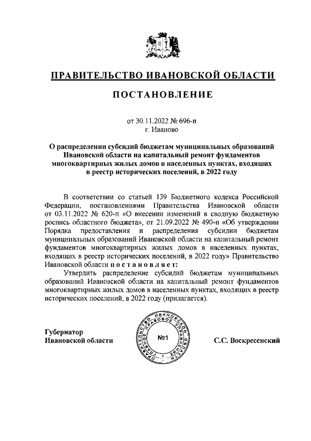 Постановление Правительства Ивановской области от 30.11.2022 N 696-п "О распределении субсидий бюджетам муниципальных образований Ивановской области на капитальный ремонт фундаментов многоквартирных жилых домов в населенных пунктах, входящих в реестр исторических поселений, в 2022 году"