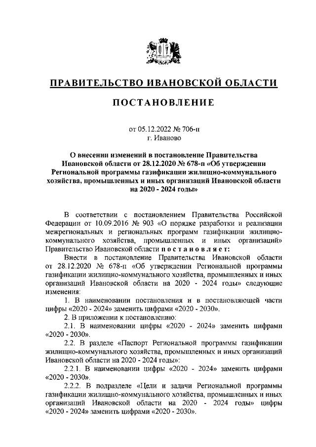 Постановление Правительства Ивановской области от 05.12.2022 N 706-п "О внесении изменений в постановление Правительства Ивановской области от 28.12.2020 N 678-п "Об утверждении Региональной программы газификации жилищно-коммунального хозяйства, промышленных и иных организаций Ивановской области на 2020 - 2024 годы" (вместе со "Сводным планом-графиком догазификации", "Пообъектным планом-графиком догазификации")